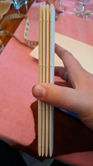The quires I’m using were pre-folded and punched for a Carolingian style binding I had planned to do. They are prepped for four sewing stations (holes where the thread can come up through the quires), the first two at 15 mm and the other two roughly 65 mm from the head and tail. This is similar to sewing stations employed in existing limp bindings. (See Szirmai, at page 294.)
