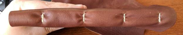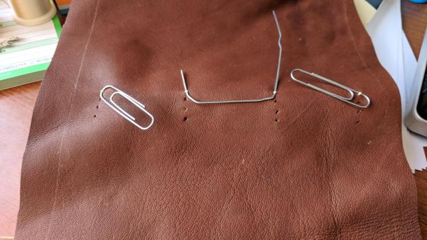 I measured out the size I needed for my cover, including a triangular flap cut the leather slightly too large for the text block so I could clean it up once everything was put together. (For a discussion of front edge flaps and ties, see Szirmai, at page 294.) I created a template from the holes punched in my quires to pre-stab my sewing stations in the leather. My hope was that doing this would help ensure the visible sewing was straight and tidy.