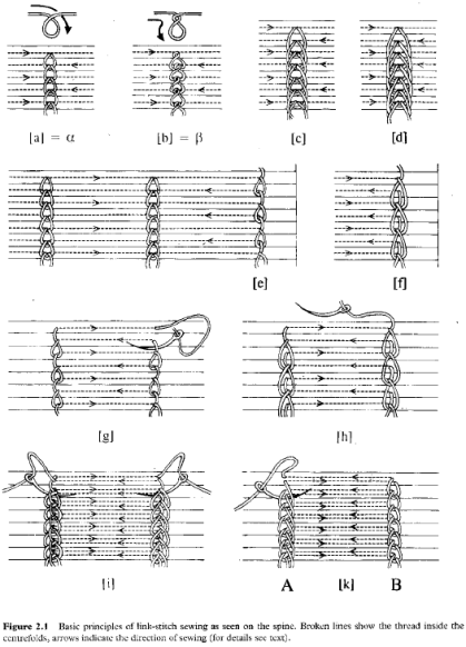 The limp bindings studied by Szirmai use one of three stitching methods, independent long stitch, link stitch, and all-along on exterior supports. A sewing frame may not have been necessary for limp bindings, as the quires were not sewn first to supports that needed to be kept taut during the sewing process. The following table from Szirmai, page 17, shows the various types of link stitch employed in bookbinding from the earliest period.